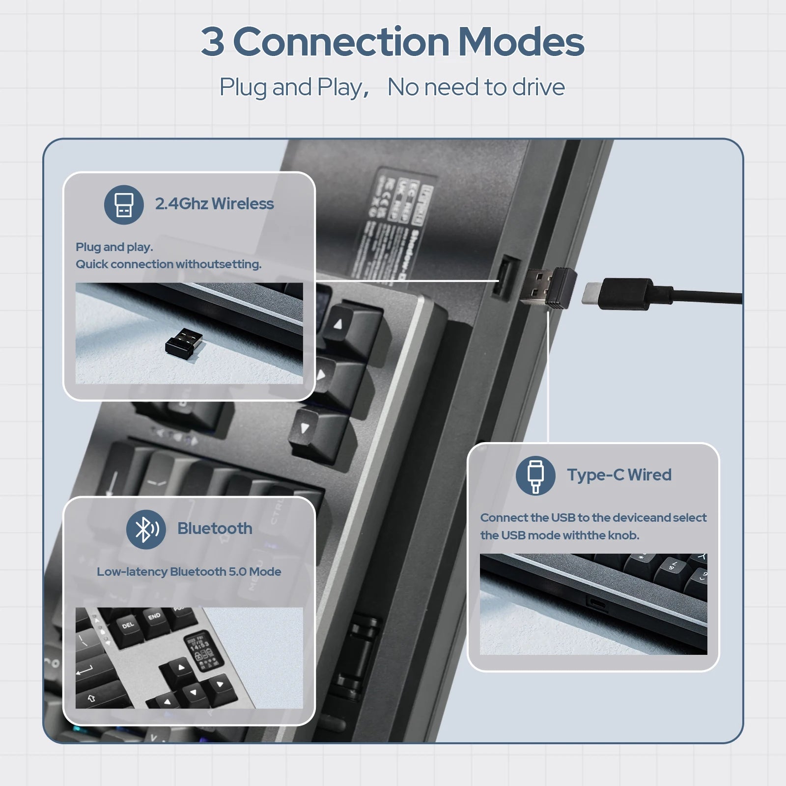 - Three connectivity modes: USB-C, Bluetooth 5.1 & 2.4Ghz